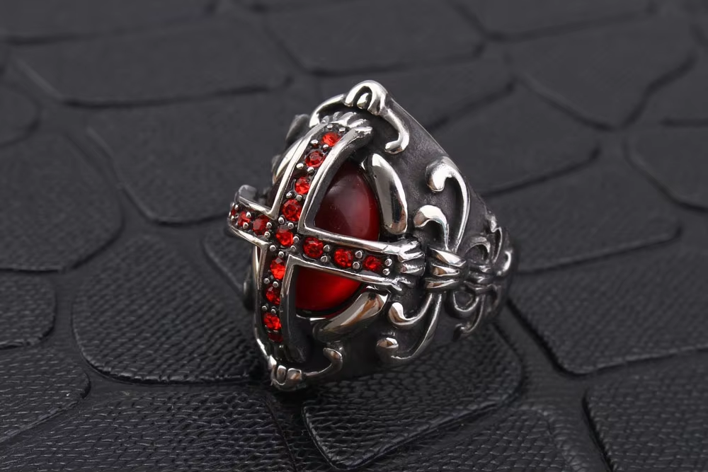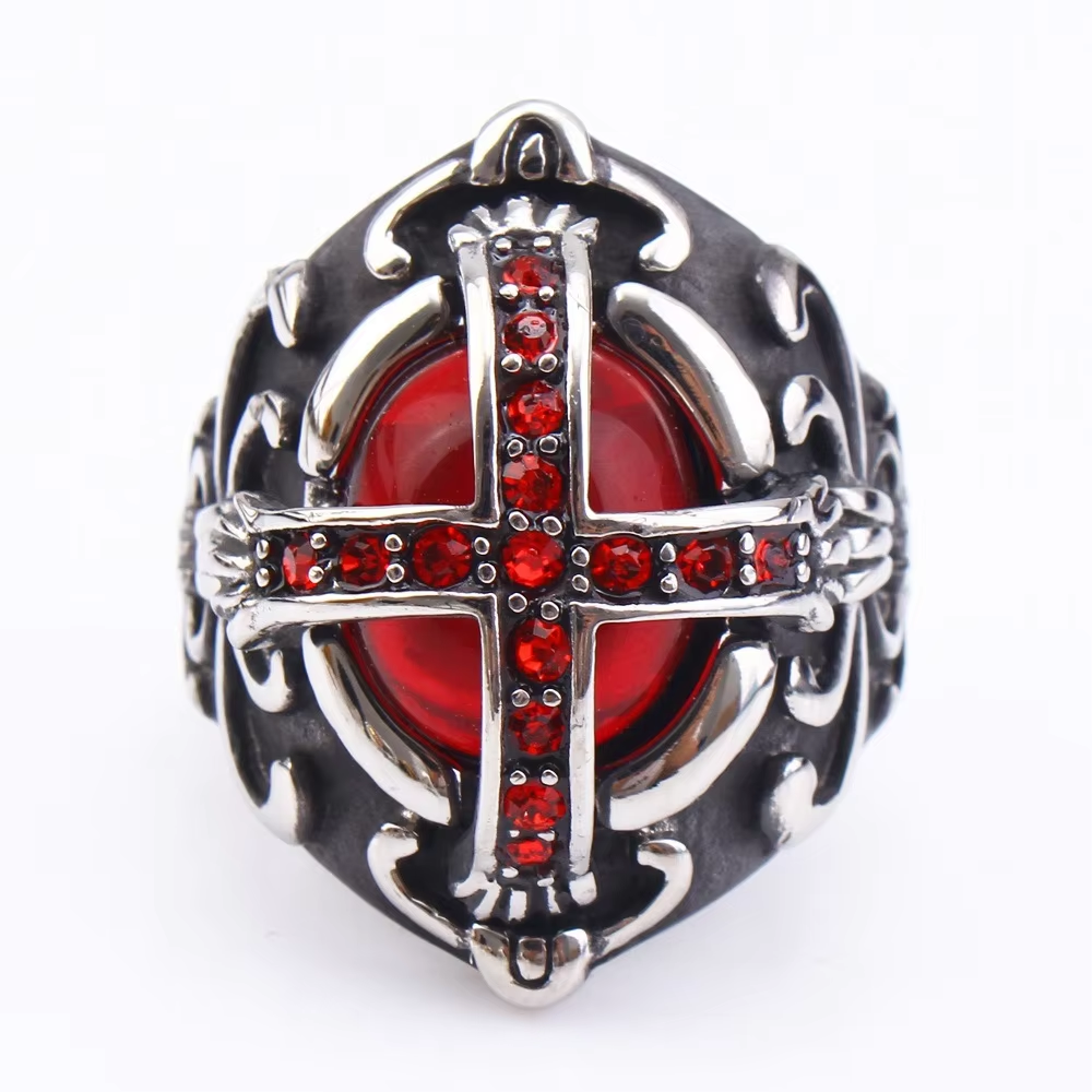 European and American New Retro Jewelry Gothic Trendy Men's Cross Ring Stainless Steel Ring Red Diamond Ring